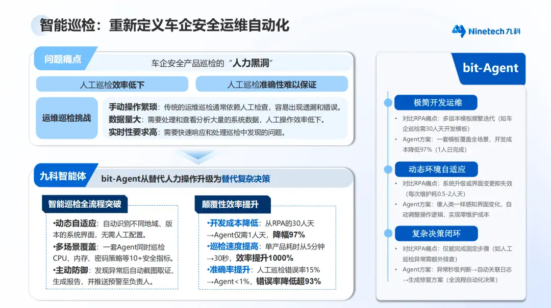 在车企安全运维场景中,传统RPA技术开发全部场景的巡检模板需30人天,且系统升级或界面变化后模板即失效;而bit-Agent仅通过一套模板,便可全面覆盖安全巡检场景,开发成本得到大幅降低,且Agent可以像人类一样感知界面变化,自动调整操作逻辑,实现零成本维护。