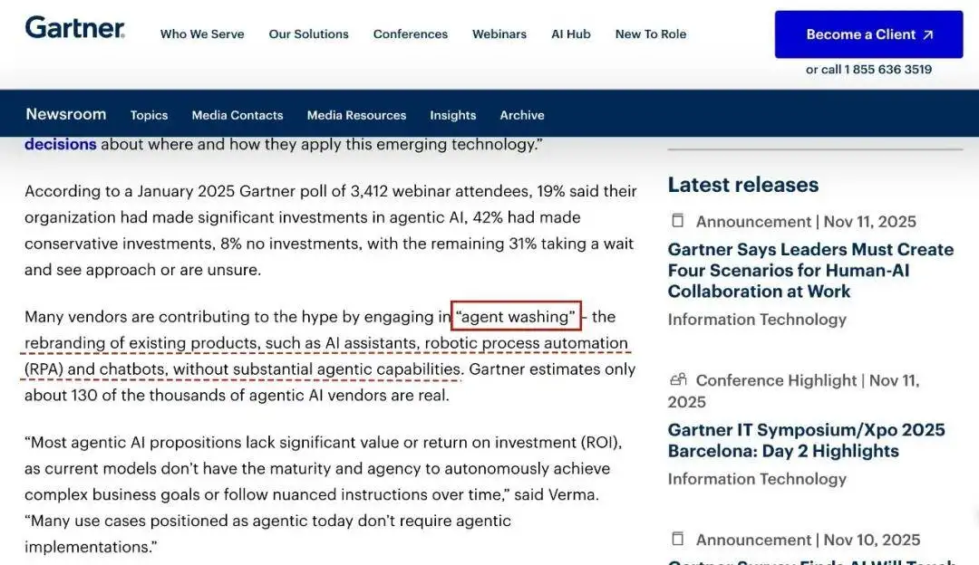 市面上许多厂商存在“Agent Washing”的炒作现象(图源:Gartner)