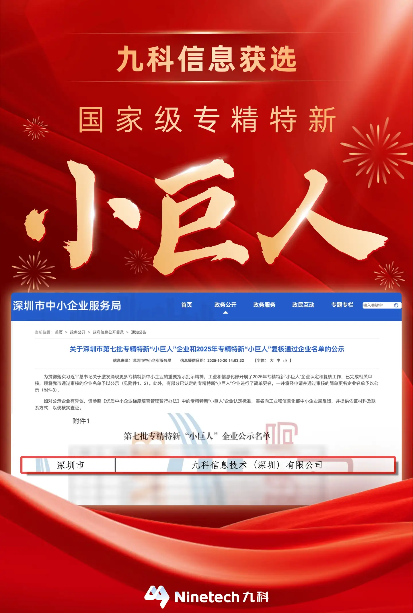近日,第七批国家级专精特新“小巨人”企业名单已发布公示,九科信息技术(深圳)有限公司凭借在智能自动化领域的深厚积淀,成功获评国家级专精特新“小巨人”企业。