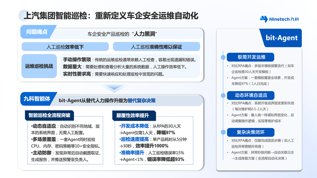 在上汽集团的安全运维场景中,bit-Agent仅通过一套模板,便可全面覆盖安全巡检场景,开发成本得到大幅降低;且Agent可以像人类一样感知界面变化,自动调整操作逻辑,实现零成本维护;同时,还将单个产品的巡检耗时从5分钟压缩至30秒,让巡检错误率降低超93%。