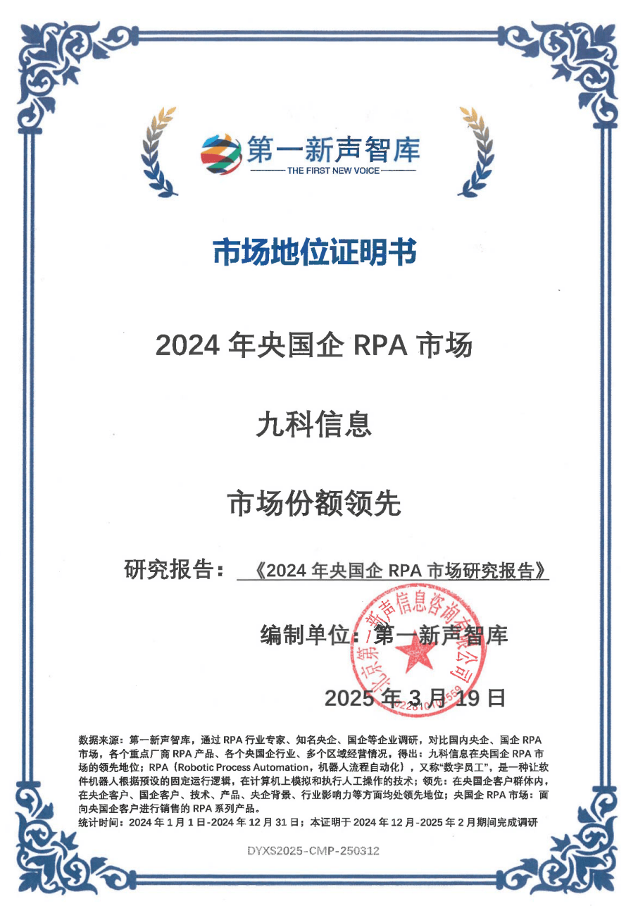 第一新声智库报告显示,九科信息在去年的国央企智能自动化市场份额位居榜首,尤其在制造、交通两大核心行业占据绝对优势,金融、能源行业亦位列前茅。在“国产替代”不断加速的信创冲刺阶段,九科信息在央企客户市场渗透率已超20%。