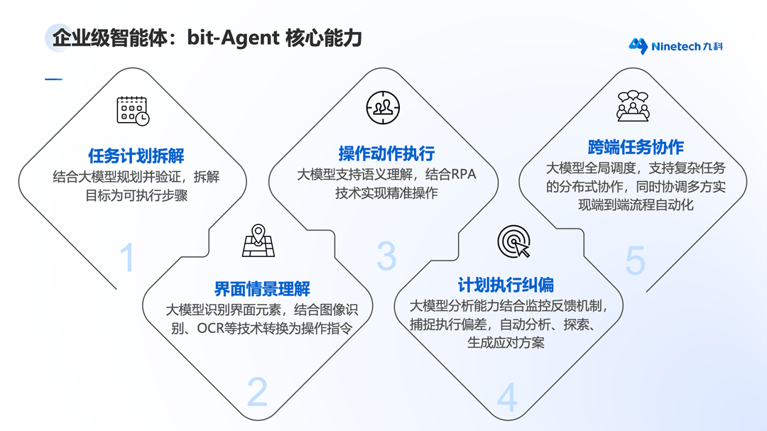 九科信息的明星产品「企业级智能体bit-Agent」可实现对桌面应用、网页系统、客户端软件的无代码自动化操控。它无需人工编写脚本,即可自动识别界面元素、适配界面变化,解决了传统RPA“改一个界面、改一套流程”的高成本痛点,大幅提升了自动化方案的适配效率与稳定性。